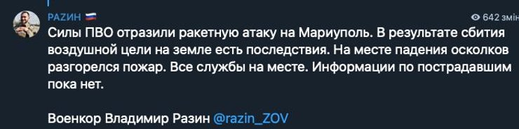 Российские военные блогеры также говорят о ракетной атаке в Мариуполе.