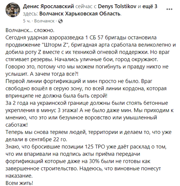 "Начались уличные бои, город окружают. Говорю это, потому что мы можем погибнуть, и правду никто не услышит. А зачем тогда все? Первой линии фортификаций и мин на границе Украины и России в Харьковской области просто не было, поэтому оккупанты свободно зашли в серую зону по всей линии границы, которая не должна быть серой", — рассказал он о ситуации.