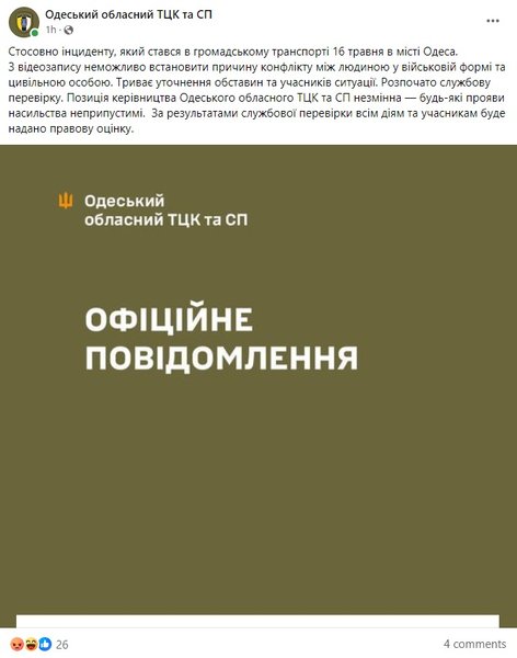 "Продолжается уточнение обстоятельств и участников ситуации. Начата служебная проверка. Позиция руководства Одесского областного ТЦК и СП неизменна — любые проявления насилия недопустимы. По результатам служебной проверки всем действиям и участникам будет дана правовая оценка", — говорится в официальном сообщении.