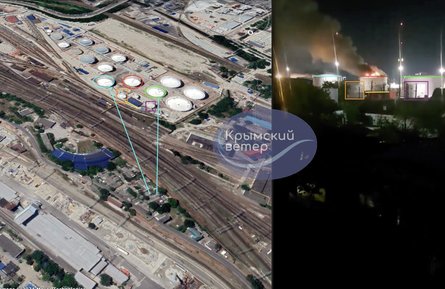 Мониторинговая группа "Крымский ветер" сообщает, что в Новороссийске произошло попадание в мазутный терминал. Спутниковые снимки показывают пожар. Под атакой дронов был терминал "Транснефти" и порт Новороссийска.