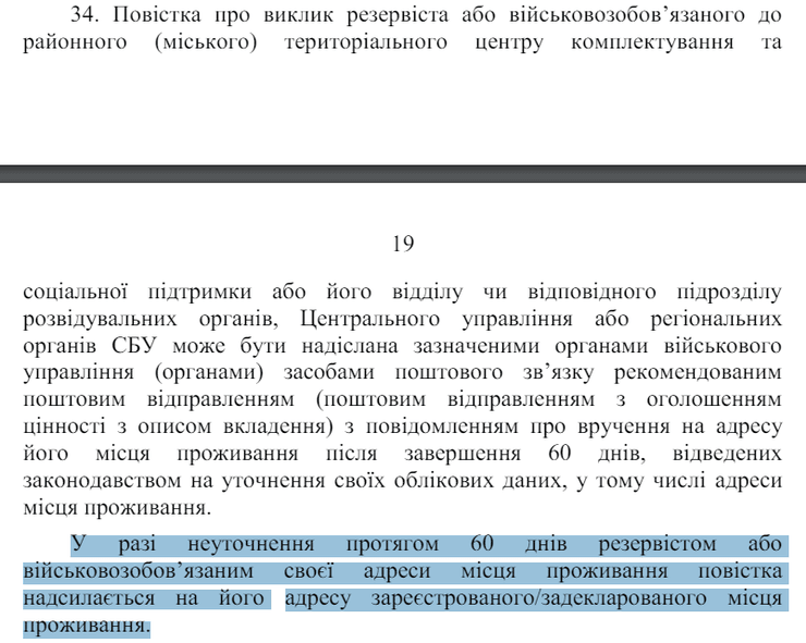 В случае неуточнения в течение 60 дней резервистом или военнообязанным своего адреса места жительства повестка направляется на его адрес зарегистрированного или задекларированного места жительства.
