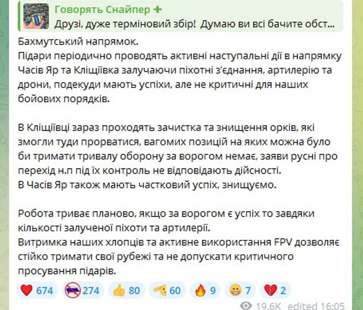 "Часов Яр. Также имеют частичный успех, уничтожаем. Работа продолжается планово, если за врагом есть успех, то благодаря количеству привлеченной пехоты и артиллерии. Выдержка наших ребят и активное использование FPV позволяет устойчиво держать свои рубежи и не допускать критического продвижения п**аров", — написал он.