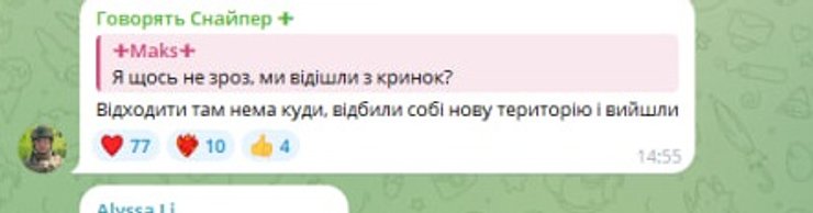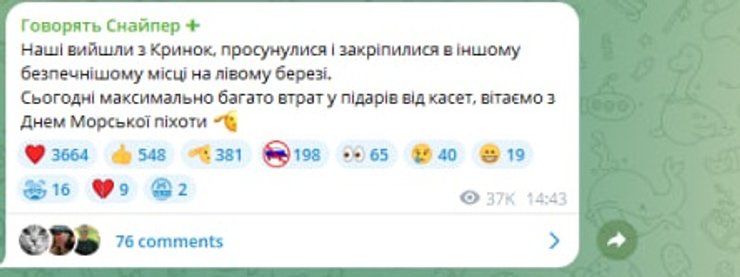 "Наши вышли из Крынок, продвинулись и закрепились в другом более безопасном месте на левом берегу", — проинформировал он.