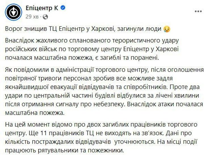 "Компания "Эпицентр" выражает печаль и глубокие соболезнования семьям погибших и раненых. Семьям сотрудников будет оказана вся необходимая поддержка", — сообщили в компании.