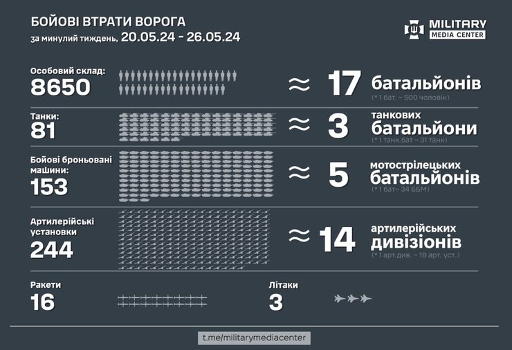 Так, в период с 20 по 26 мая потери ВС РФ в Украине составили: