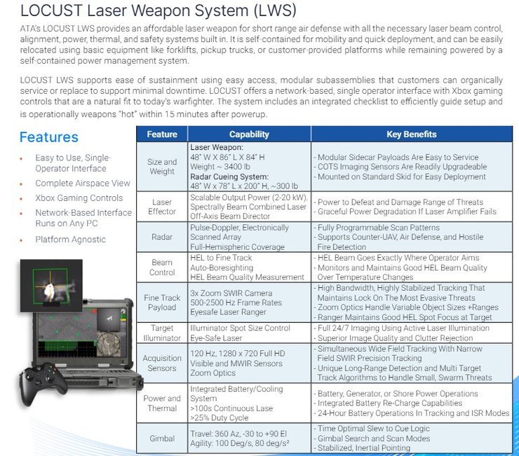 LOCUST мощностью до 20 кВт представляет собой лазерное оружие для ПВО малой дальности со всеми необходимыми средствами управления. Система автономна, что обеспечивает мобильность и быстрое развертывание, и может быть легко перемещаться с помощью базового оборудования.