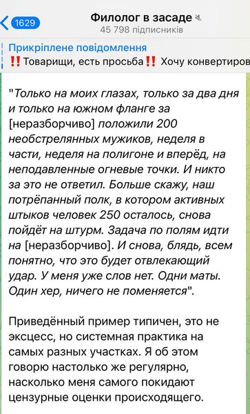 "Только на моих глазах, только за два дня и только на южном фланге положили 200 необстрелянных мужиков, неделю в части, неделю на полигоне и вперед, на неподавленные огневые точки. И никто за это не ответил. Больше скажу, наш потрепанный полк, в котором активных штыков осталось 250, снова пойдет на штурм", — говорится в сообщении.