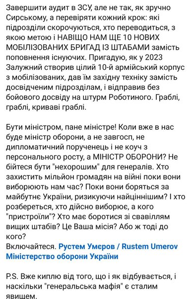 "Когда уже у нас будет министр обороны, а не завхоз, не дипломатический поручик и не коуч по персональному росту, а министр обороны? Не бойтесь быть "нехорошим" для генералов. Кто должен бороться с произволом высших штабов? Это — Ваша миссия? Или же тогда к кому? Включайтесь, Рустем Умеров. Уже киплю от того, что и как происходит, и насколько "генеральская мафия" является устойчивым явлением", — резюмировала Марьяна Безуглая.