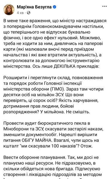 Нардеп требует от министра "быть министром", разобраться наконец с ТЦК и вывести их из Сухопутных войск, "где их прятал каждый Главнокомандующий ВСУ". Также Безуглая призывает главу Минобороны перестать прикрывать "генеральскую мафию".