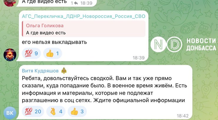 В то же время "Новости Донбасса" обратили внимание, что администратор местной пророссийской группы отказался выкладывать видео с места удара. Обычно, отмечают там, подобное происходит, когда "прилетает" по военному объекту россиян.