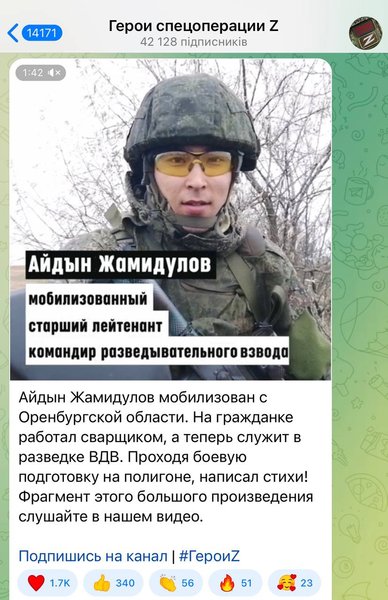 28-летний Айдын Жамидулов получил известность в РФ благодаря "патриотическим" стихам, которые он писал во время подготовки к боевым действиям в Украине. Оккупант фигурировал в публикациях Министерства обороны РФ, читал на видео свои стихи и рассказывал, что дома его ждут жена и две дочери.