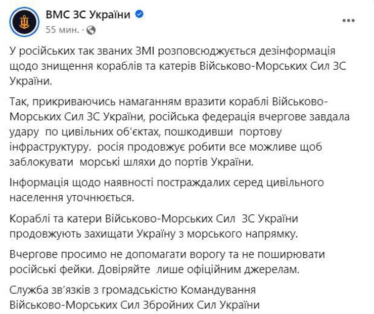 "В российских так называемых СМИ распространяется дезинформация об уничтожении кораблей и катеров Военно-Морских Сил ВС Украины. Так, прикрываясь попыткой поразить корабли Военно-Морских Сил ВС Украины, РФ в очередной раз нанесла удар по гражданским объектам, повредив портовую инфраструктуру", — говорится в сообщении.