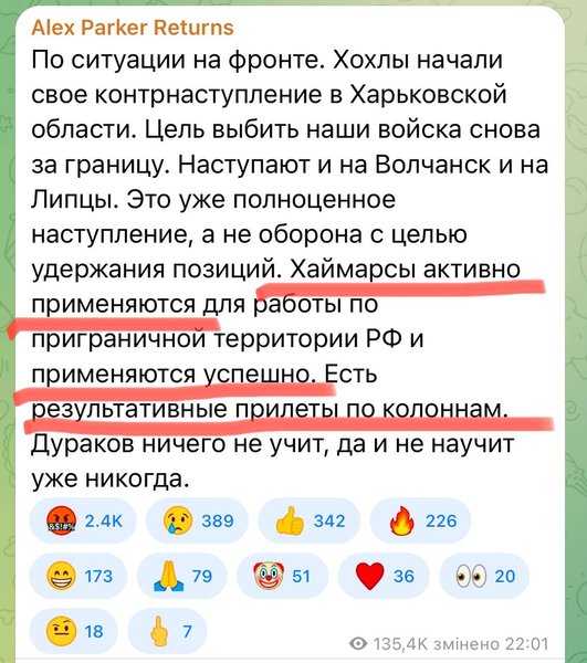 "Относительно ситуации на фронте. Х*хлы начали свое контрнаступление в Харьковской области. Цель — выбить войска РФ снова за границу. Наступают и на Волчанск, и на Липцы. Это уже полноценное наступление, а не оборона с целью удержания позиций. "Хаймарсы" активно применяются для работы на приграничной территории РФ и применяются успешно. Есть результативные прилеты по колоннам", — проинформировал оккупант.