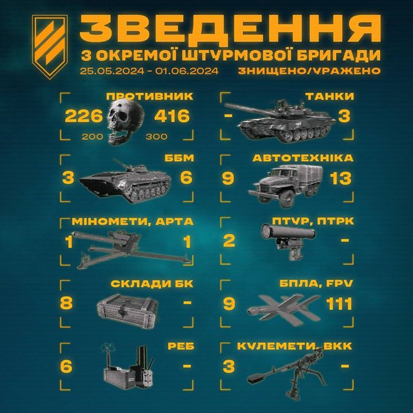 "Оккупанты не отступают с Харьковщины. Еще более 600 россиян ликвидированы Третьей штурмовой. В течение недели подразделения Третьей штурмовой бригады отражали новые атаки врага, возвращали позиции и плотно минусовали живую силу оккупантов", — подытожили работу своих подразделений за неделю в 3-й ОШБр.