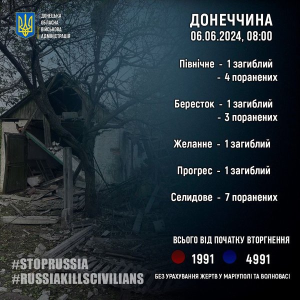 В среду, 5 июня ВС РФ нанесли удары по нескольким населенным пунктам Донецкой области, в результате чего погибли мирные жители. Об этом сообщил начальник областной военной администрации Вадим Филашкин.