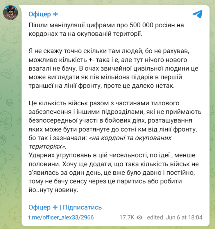 "Пошли манипуляции цифрами о 500 000 россиян на границах и на оккупированной территории. Я не скажу точно сколько там людей, потому что не считал, возможно количество +- такое и есть, но здесь ничего нового вообще не вижу", — написал "Алекс".