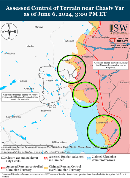Аналитики ссылаются на одного из российских военкоров, который утверждал, что ВС РФ продвинулись на 400 метров на Волчанском направлении. 6 июня продолжались бои возле Агрегатного завода в центре Волчанска, а также возле Старицы и Бугруватки (к юго-западу от Волчанска).