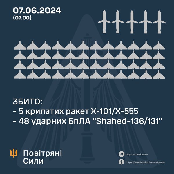 В результате, отмечают в Воздушных силах, в Днепропетровской, Запорожской, Кировоградской, Николаевской, Херсонской, Одесской, Харьковской, Киевской и Хмельницкой областях было сбито 48 ударных БпЛА и все крылатые ракеты.