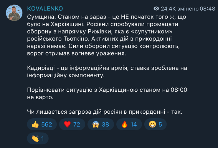 Андрей Коваленко заявил, что то, что происходит на Сумщине сейчас — это не начало того, что было на Харьковщине.
