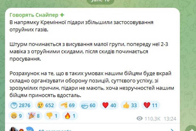"В направлении Кременной п**ары увеличили применение ядовитых газов. Штурм начинается с выдвижения малой группы, впереди нее 2-3 "мавика" с ядовитыми сбросами, после сбросов начинается продвижение. Расчет на то, что в таких условиях нашим бойцам будет крайне сложно организовать оборону позиций, существенного успеха, по понятным причинам, п**ары не имеют, хотя неудобств нашим бойцам приносят достаточно", — говорится в сообщении.