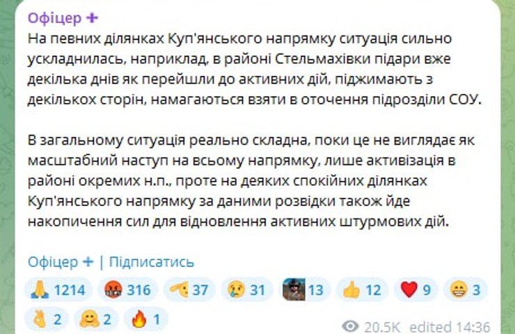 "На определенных участках Купянского направления ситуация сильно осложнилась, например, в районе Стельмаховки п**ары уже несколько дней как перешли к активным действиям, поджимают с нескольких сторон, пытаются взять в окружение подразделения Сил обороны Украины", - проинформировал в своем телеграмм-канале "Офицер+" боец ВСУ с позывным "Алекс".