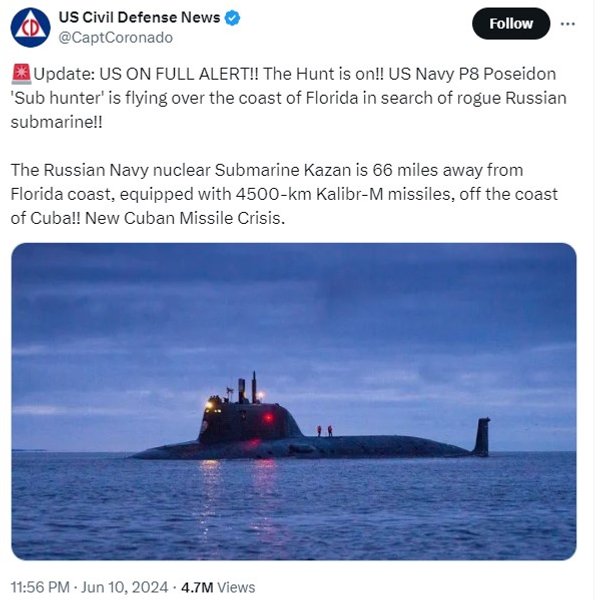 Россия направила на Кубу атомную подводную лодку "Казань" класса "Ясень-М", из-за чего ВМС США запустили в небо "охотника за подводными лодками" самолет P-8 Poseidon. По информации канала US Civil Defense News, российская субмарина находится в 70 милях от побережья Флориды.
