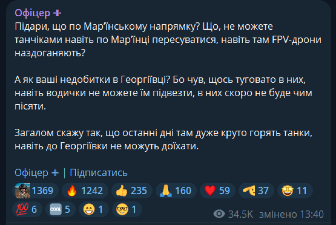 "Что, не можете танчиками даже по Марьинке передвигаться, даже там FPV-дроны догоняют?" — отметил он.