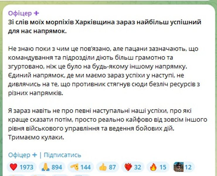 "Харьковщина сейчас наиболее успешное для нас направление. Не знаю пока с чем это связано, но пацаны отмечают, что командование и подразделения действуют более грамотно и сплоченно, чем это было на любом другом направлении. Единственное направление, где мы имеем сейчас успехи в наступлении, несмотря на то, что противник стянул сюда множество ресурсов с разных направлений", — проинформировал он.