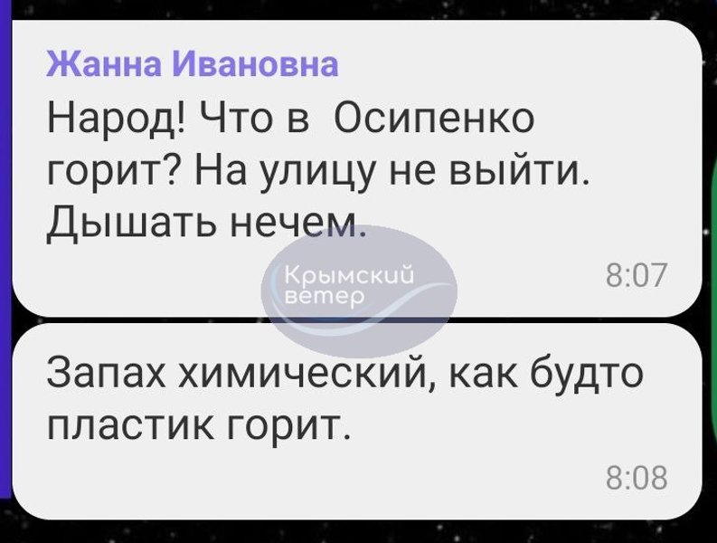 Также в селе Осипенко пожаловались на химический запах, будто пластик горит, из-за которого "дышать нечем". Запах дыма почувствовали и в поселке Кача неподалеку.