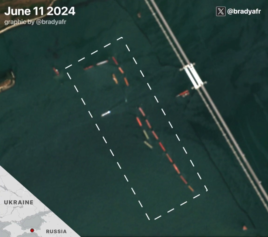 Днем 12 июня появилось сообщение, в котором говорилось о действиях военных ВС РФ возле Крымского моста. Как выяснилось, накануне OSINT-расследователь Brady Africk разместил спутниковые фото, на которых показал баржи, установленные на северо-западной части сооружения (ближе к оккупированной Керчи). На фото можно увидеть, что еще 1 мая там стояла одна баржа, 1 июня — девять, а 11 июня — 11.