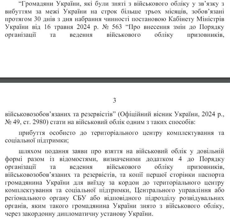 Согласно документу, сделать это военнообязанные украинцы "обязаны в течение 30 дней со дня вступления в силу постановления Кабинета Министров Украины от 16 мая 2024 г. № 563".