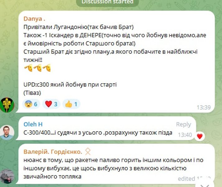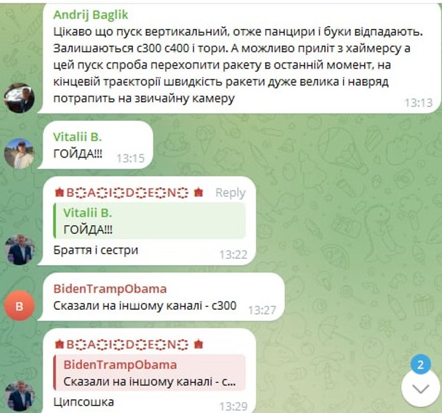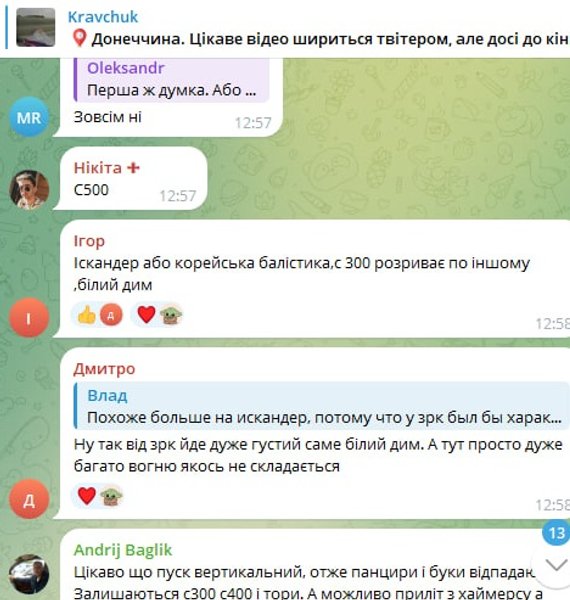 - Интересно что пуск вертикальный, следовательно "Панцири" и "Буки" отпадают. Остаются С-300, С-400 и "ТОРы". А, возможно, прилет с "Хаймарса", а этот пуск — попытка перехватить ракету в последний момент, на конечной траектории скорость ракеты очень большая и вряд ли попадет на обычную камеру.