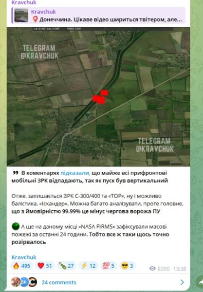 "Интересное видео распространяется твитером, но до сих пор до конца неизвестно, что происходит. На видео скорее всего пуск ракеты из неизвестной системы. Глядя на местоположение, вполне вероятно какой-то ЗРК (47,84859 37,67839). Пуск ракеты начинается и моментально заканчивается мощным взрывом на месте вероятной пусковой установки", — говорится в сообщении милитарного телеграм-канала "Кravchuk".