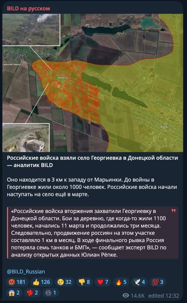 В качестве примера, он привел публикацию аналитика немецкого издания Юлиана Рёпке, который заявил о захвате россиянами Георгиевки, ссылаясь на открытые данные.