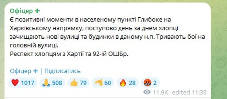Силы обороны имеют положительные новости из Харьковской области. Им удалось продвинуться в поселке Глубокое в Харьковском районе. Об этом в своем телеграм-канале "Офицер+" 18 июня сообщил офицер ВСУ с позывным "Алекс".
