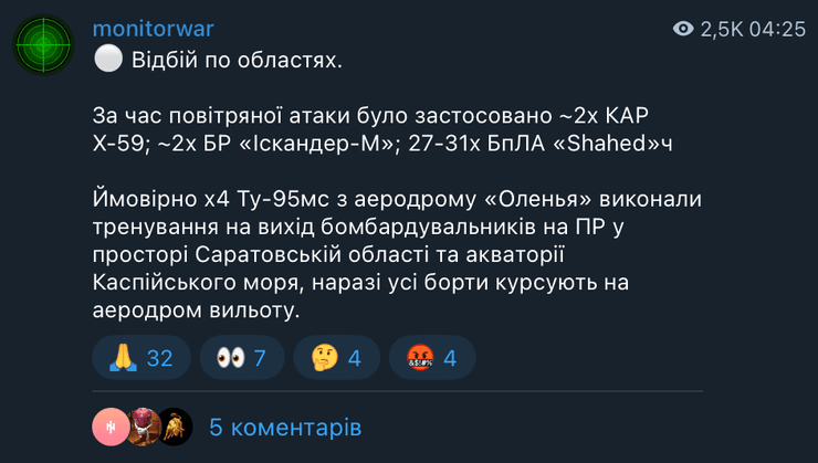 Аналитики около 4:25 сообщили, что четыре Ту-95МС с аэродрома "Оленья" могли выполнить тренировку на выход бомбардировщиков на пусковые рубежи в воздушном пространстве Саратовской области и акватории Каспийского моря.