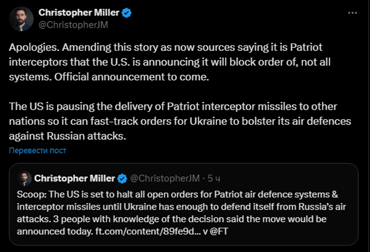 "Извинения. Поправка к этой истории: теперь источники говорят, что США объявили о блокировании заказа именно перехватчиков Patriot, а не всех систем. Официальное объявление будет позже. США приостанавливают поставку ракет-перехватчиков Patriot другим странам, чтобы ускорить выполнение заказов для Украины, чтобы укрепить ее противовоздушную оборону от российских атак", — говорится в сообщении журналиста.