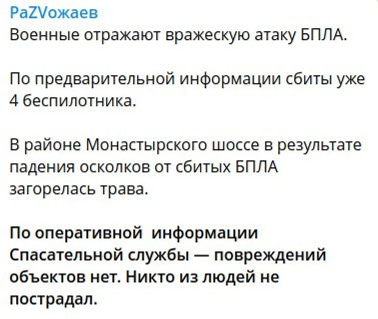 "Военные отражают вражескую атаку БпЛА. По предварительной информации, сбиты уже 4 беспилотника. В районе Монастырского шоссе в результате падения обломков от сбитых БпЛА вспыхнула трава. По оперативной информации Спасательной службы — повреждений объектов нет. Никто из людей не пострадал", — отчитался Развожаев.