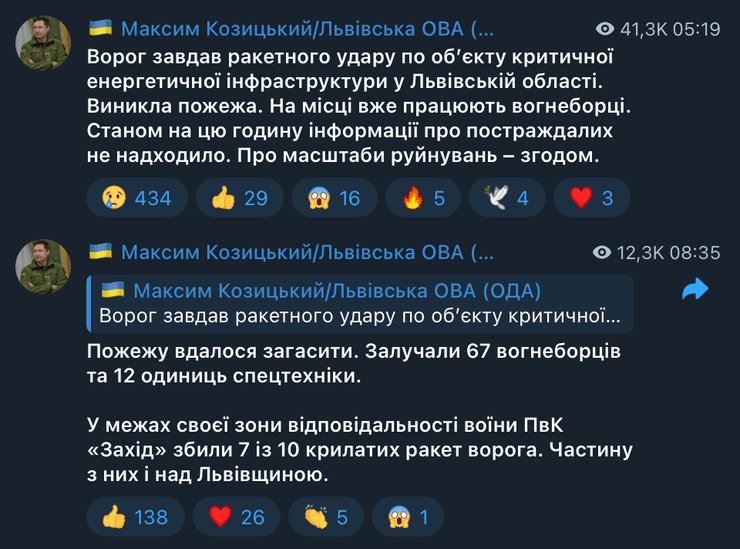 Председатель Львовской ОГА Максим Козицкий отметил, что противник нанес ракетный удар по объекту критической энергетической инфраструктуры, в результате чего возник пожар.