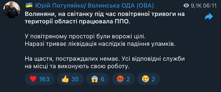 Юрий Погуляйко, председатель Волынской ОВА рассказал, что на рассвете в регионе работала ПВО, в результате падения обломков никто не пострадал.
