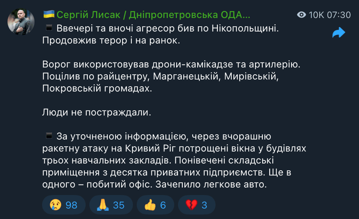 "Враг использовал дроны-камикадзе и артиллерию. Попал по райцентру, Марганецкой, Мировской, Покровской громадах. Люди не пострадали", — подчеркнул Лысак.
