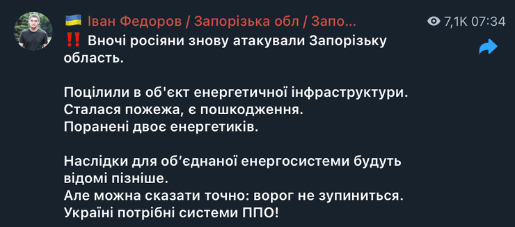 Председатель Запорожской ОГА Иван Федоров отметил, что россияне попали в объект энергетической инфраструктуры в регионе, в результате чего произошел пожар и есть повреждения. Также ранения получили двое энергетиков.