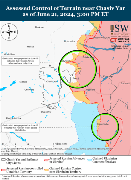 Российские войска 21 июня продолжили наступательные действия на Сиверском направлении, однако подтвержденных изменений линии фронта на этом участке не произошло. Российские военкоры утверждали, что ВС РФ закрепились на окраине Роздоловки, но в ISW не нашли подтверждений.