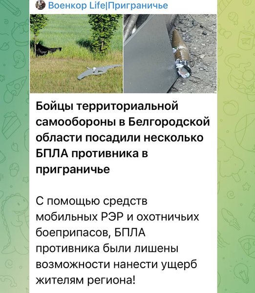 В качестве доказательства он разместил публикацию российского телеграм-канала "Военкор Life|Приграничье", где автор хвастается ловкостью и меткостью белгородских терообороновцев, которые смогли ликвидировать украинские дроны.