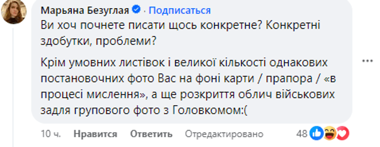 "Вы хоть начнете писать что-то конкретное? Конкретные достижения, проблемы? Кроме условных открыток и большого количества одинаковых постановочных фото вас на фоне карты/флага/"в процессе мышления", а еще раскрытие лиц военных для группового фото с Главкомом", — написала Безуглая.