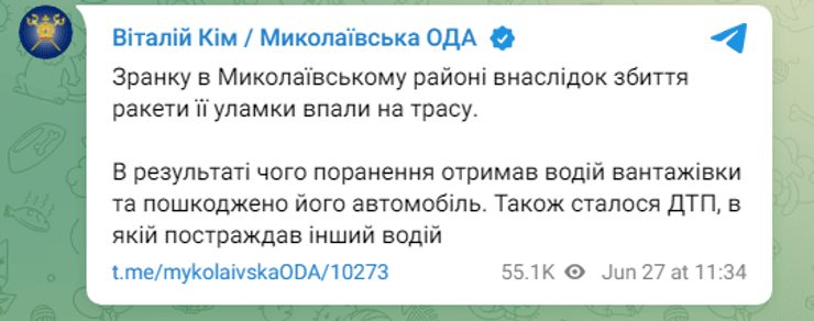 В Николаевской области падение обломков российской ракеты на проезжую часть повлекло ДТП. Об этом 27 июня сообщил глава Николаевской областной военной администрации Виталий Ким в своем Telegram-канале.