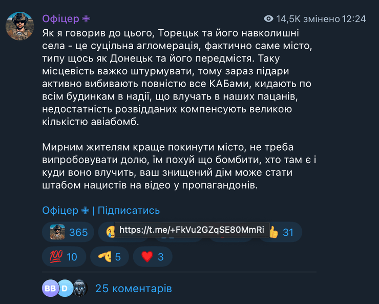 Вооруженным силам Российской Федерации сложно штурмовать Торецк и его окрестные села в Донецкой области. Из-за этого противник сконцентрировался на использовании большого количества КАБов. Об этом сообщил лейтенант ВСУ с позывным "Алекс" в своем Telegram.