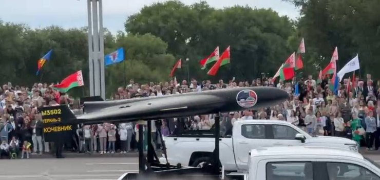 На военном параде в Минске, посвященному годовщине независимости Беларуси, заметили расчеты с ударными дронами "Герань-2" — аналогом иранских БПЛА Shahed. Видео было опубликовано на официальном сайте главы РБ Александра Лукашенко.
