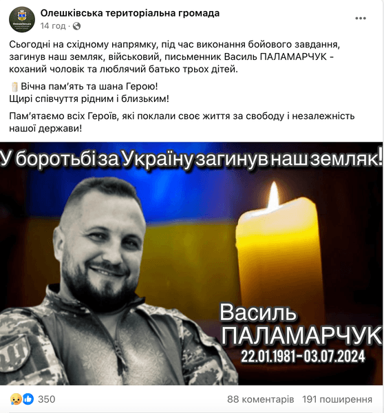 "На восточном направлении, во время выполнения боевого задания, погиб наш земляк, военный, писатель Василий Паламарчук — любимый муж и любящий отец троих детей. Вечная память и уважение Герою! Искренние соболезнования родным и близким!" — говорится в сообщении.