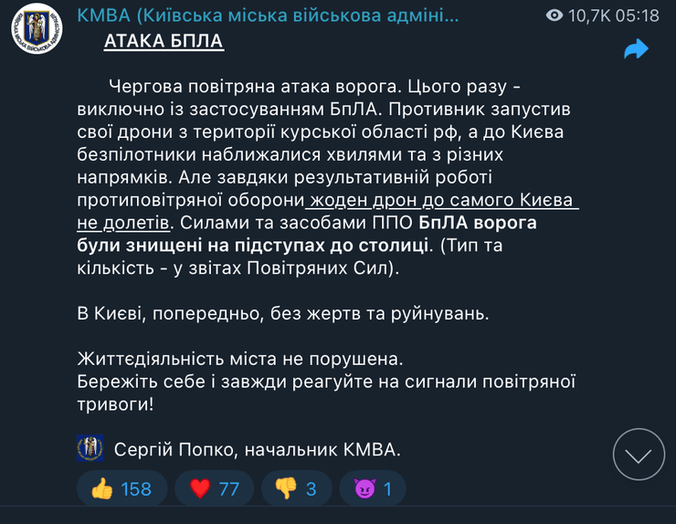"Благодаря результативной работе противовоздушной обороны ни один дрон до самого Киева не долетел. Силами и средствами ПВО БПЛА врага были уничтожены на подступах к столице", — сказал начальник КМВА Сергей Попко.